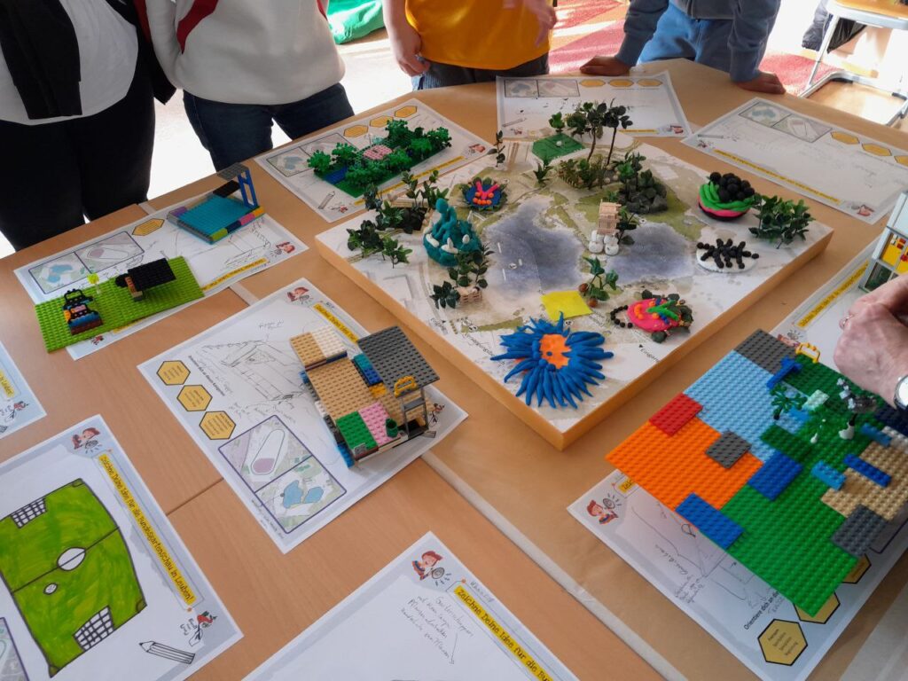 Am zweiten Tag startete nach einer kurzen Wiederholung der Ergebnisse vom Vortag die Ideenwerkstatt, die auch am dritten Tag durchgeführt wurde. Dafür wurden drei verschiedene Stationen angeboten: Malen, Basteln und Bauen mit Lego. Viele Kinder nutzten das Malen zunächst zur Ideenfindung, um ihre Vorstellungen anschließend an den anderen Stationen weiter visuell auszuarbeiten. Auf der Zeichenvorlage sind kleine Umgebungskarten eingefügt, sodass die Kinder ihre Ideen auch verorten konnten.
