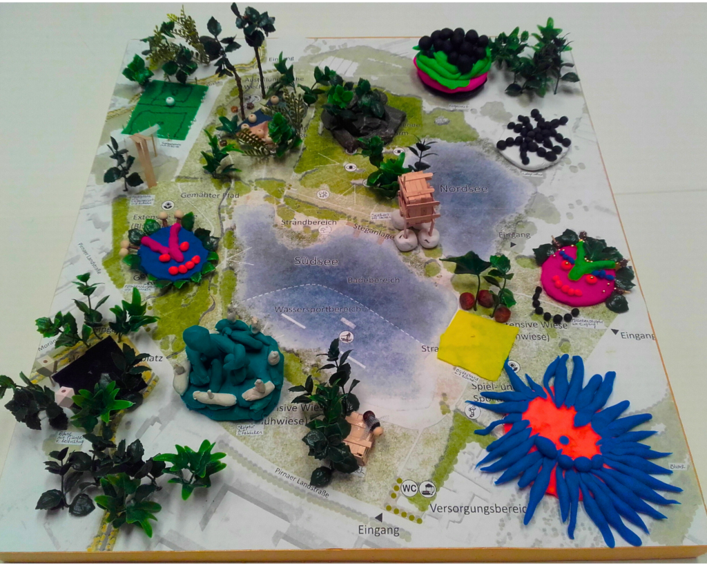 Für die Bastelstation stellten wir ein Umgebungsmodell, basierend auf der Machbarkeitsstudie der TU-Dresden, zur Verfügung. Die Schüler:innen setzten ihre Ideen dort mit verschiedensten Materialien direkt auf der Umgebungskarte um. Auf Wunsch der Lehrerin ergänzten wir das Materialangebot um Knete – ein sehr hilfreiches Mittel, das die Gestaltungsmöglichkeiten erweiterte. Die entstandenen Entwürfe wurden von uns beschriftet.