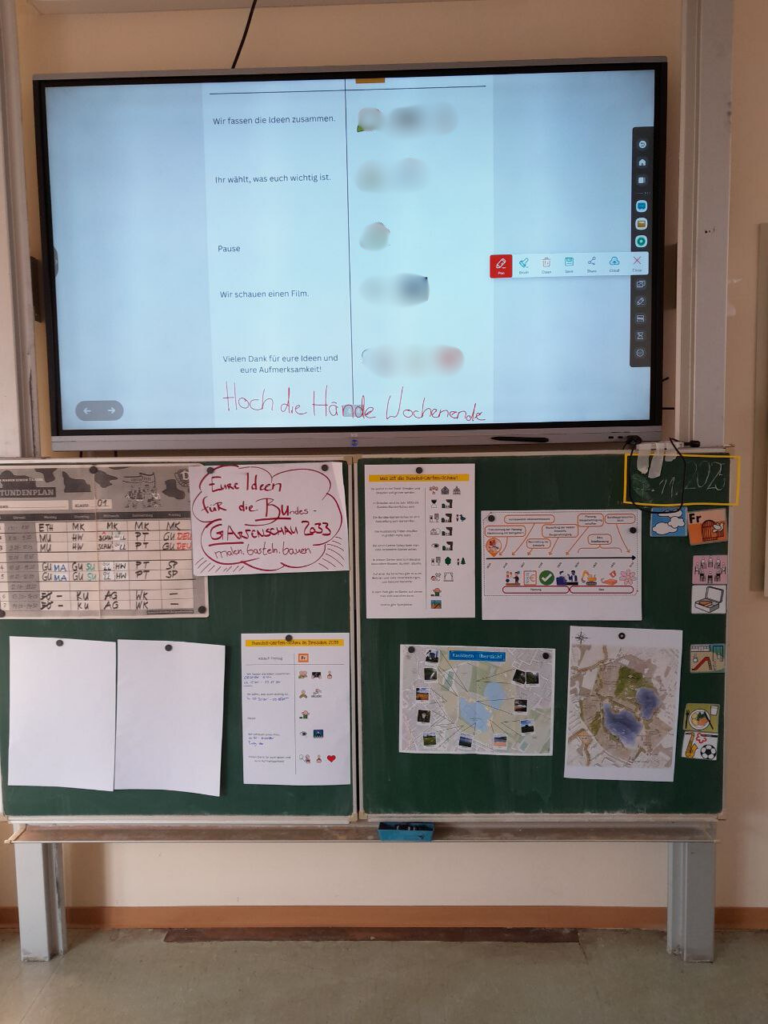 Am ersten Projekttag gaben wir eine kleine Einführung in die BUGA 2033. Nach einer Kennenlernrunde mit der Frage „Was macht ihr gerne draußen?‘ erklärte wir den Kindern mithilfe der MetaCom-Symbolen an der Smarttafel den Mehrwert der BUGA für die Stadt Dresden und ihre Bewohner:innen sowie den Ablaufplan der Projekttage. Anschließend wurde ein Drohnenvideo über die Kiesseen in Leuben gezeigt und gemeinsam eingeordnet, wie weit das Schulgelände von dem Kernareal Kiesseen Leuben entfernt liegt.